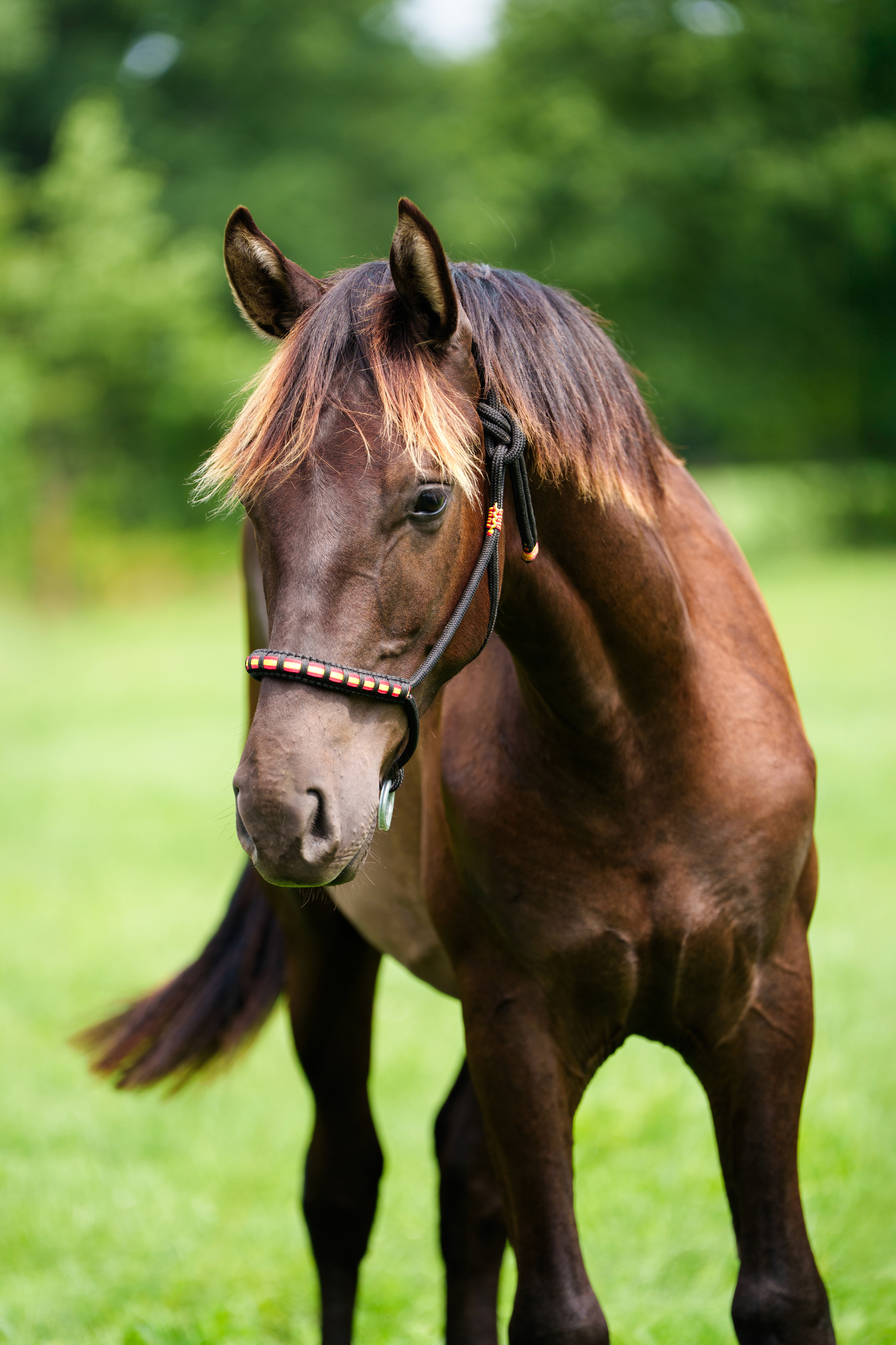 Fusion is now two years old, he is growing into a solid big moving, super super friendly gelding. He will be dark brown and end up being 1.70 at least. As a foal he very much resembled his brother Secret Poet, we expect him to grow up looking very much the same. They certainly share their totally easy demeanor, stemming from their bomb proof mom Vilma de Susaeta. Fusion has clean X Rays. He will spend the next year growing up in the fields very close to our home.