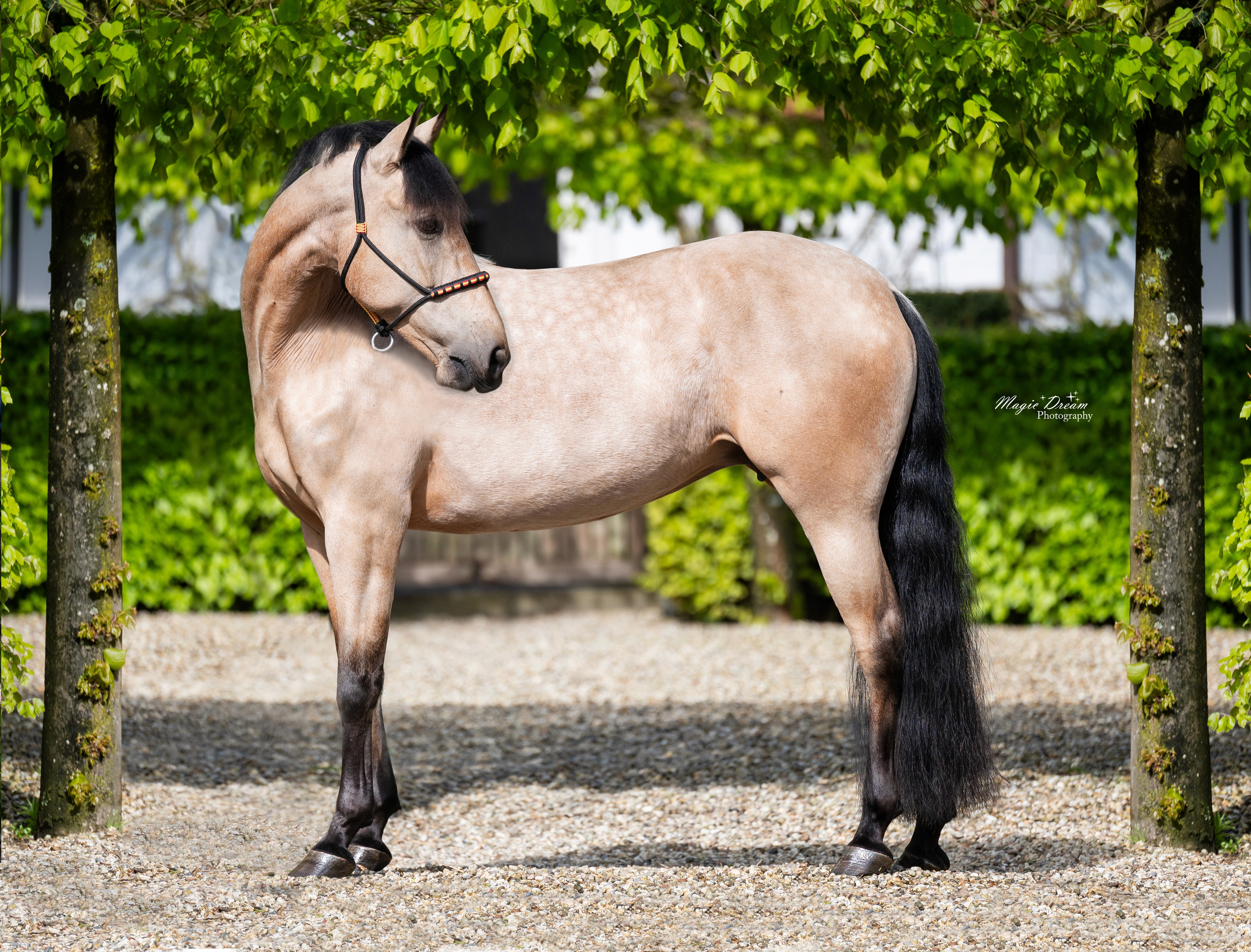 Adelfa is een moderne, goed gebouwde buckskin PRE-merrie (1,63 m) die erg mooi beweegt en uiterst vriendelijk is. Ze is een sensationele fokmerrie voor kruisingen. Al haar vier veulens bleken zeer goede bewegingen te hebben en waren bij hun eerste röntgenfoto’s allemaal volledig schoon. Ze is de moeder van zowel Project X als Troy. Ze is al een jaar niet drachtig; we zullen haar nog wat meer berijden en haar in het voorjaar opnieuw insemineren.